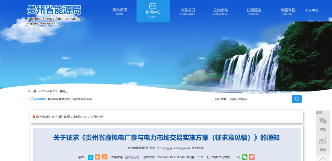 为贯彻落实国家和省关于有序推进虚拟电厂发展的部署要求,建立健全虚拟电厂参与电力市场交易机制,支持虚拟电厂参与电力市场交易。我局组织起草了《贵州省虚拟电厂参与电力市场交易实施方案(征求意见稿)》,现向社会公开征求意见,时间为2025年6月10日至7月10日。欢迎有关单位和社会各界人士提出宝贵意见建议,通过电子邮件等形式反馈省能源局经济运行协调处。